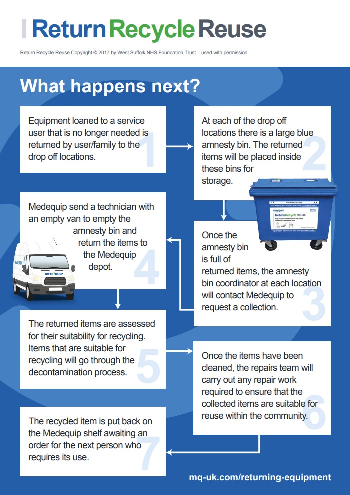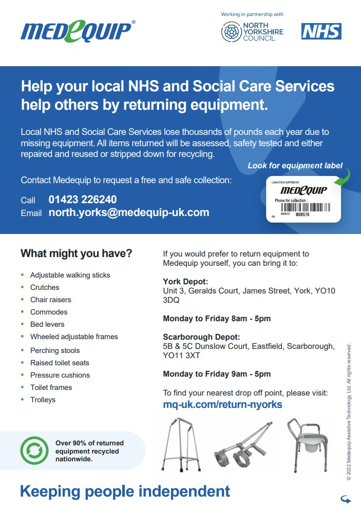 Did you know?: If you have already benefited from equipment loaned to you that you no longer need, Medequip can arrange a free collection, to recycle and help others in need. To find out more visit returning equipment or contact on 01423 226240 or email north.yorks@medequip-uk.com. Further info also available from NYC